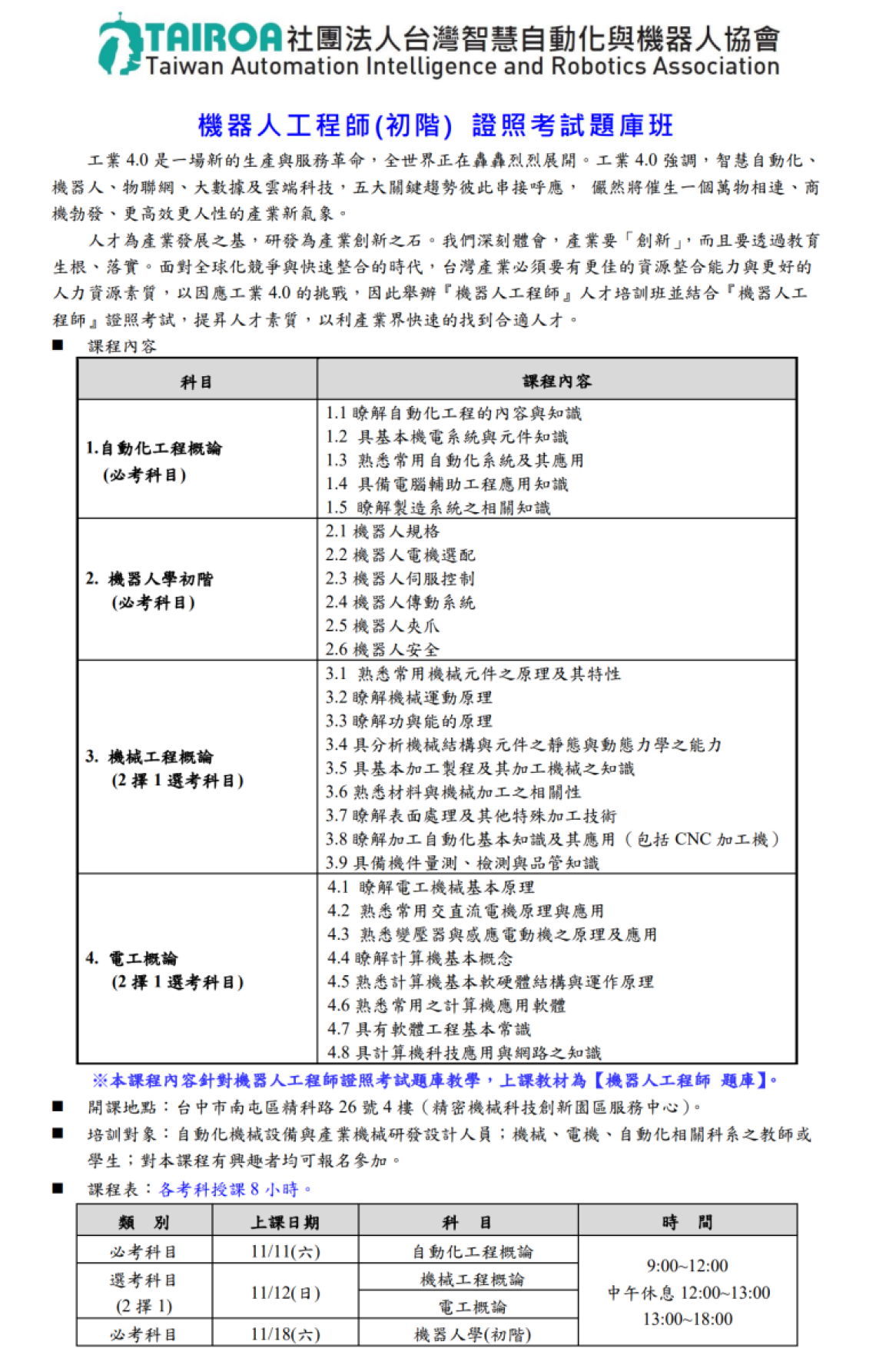 人才為產業發展之基,研發為產業創新之石。我們深刻體會產業要「創新」,而且要透過教育生根落實。面對全球化競争與快速整合的時代,台灣產業必須要有更佳的資源整合能力與更好的人力資源素質,以因應工業4.0的挑戰,因此辦理『機器人工程師』人才培訓班並結合『機器人工程師』證照考試,提昇人才素質,以利產業界快速的找到合適人才。