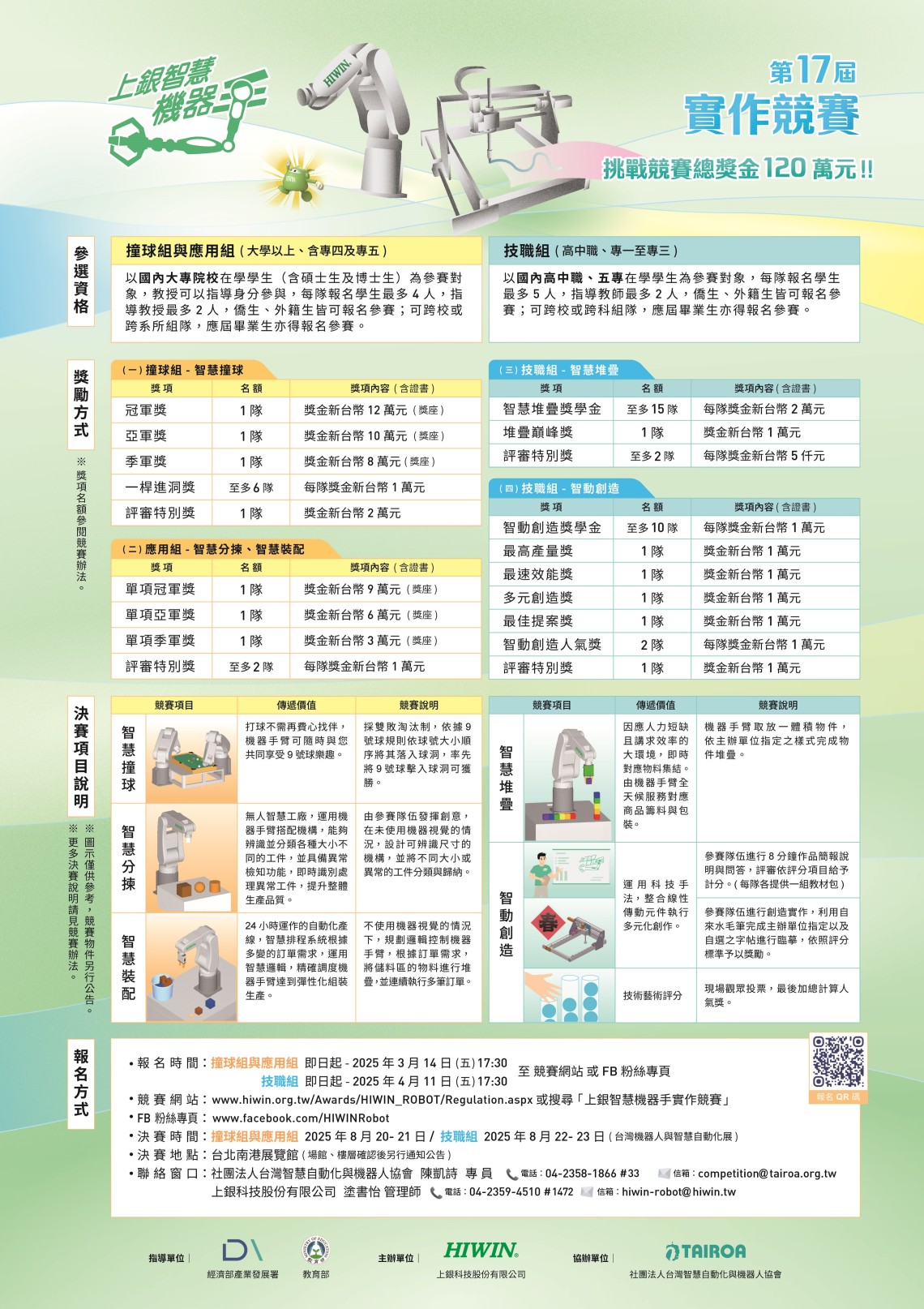 本屆第十七屆上銀智慧機器手實作競賽,將參賽組別分為「撞球組」、「應用組」(大專以上)及「技職組」(高中職),期許透過競賽方式增進學生思考力及創造力,亦發掘潛力產業人才,有效優化產學能量。